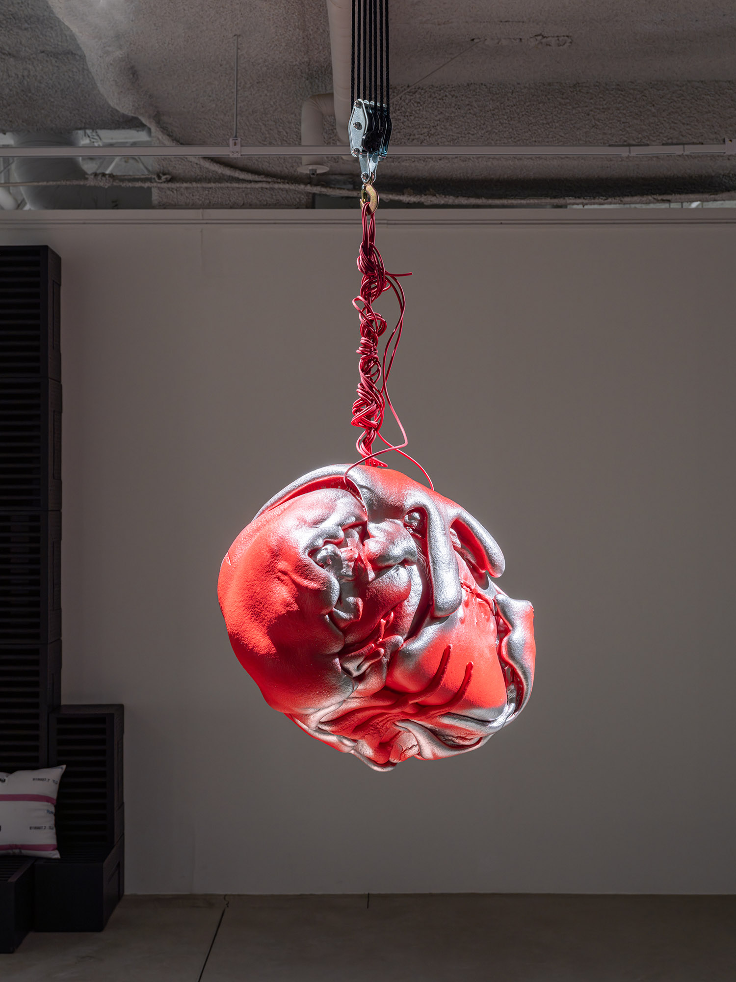 영상 〈세계의 균형〉(2025)이 불균형한 세상의 구조에 대한 비판이라면, 설치 〈바깥으로 나가서 확인해 봐야겠어요〉(2025)는 세계에 대한 행동의 의지를 보여준다. 〈세계의 균형〉에서 세계는 거대한 굴레로서, 사람들은 그 굴레에 포획된 무기력한 군중으로 표현된다. 사회를 지배하는 힘의 논리, 고단한 노동자의 삶, 끊임없이 내몰리는 치열한 경쟁의 구조에서 사람들은 각자 삶의 정점에서 빛나기 위해 가장 높이 올라가기를 열망한다. 그러나 그 정점에는 단 한 사람만 설 수 있고, 그 한 자리를 차지하기 위해 사람들이 서로를 밟고 올라가는 냉혹한 현실이 드러난다. 그럼에도 영상은 불균형의 가장 끝에 내몰린 존재들, 즉 죽음의 경계에 서 있거나 위험에 처한 사람들의 이야기에도 주목한다. 이는 컨테이너에 깔려 목숨을 잃는 노동자, 반도체를 만들기 위해서 백혈병에 걸리는 노동자, 배터리 생산 중 화재로 유명을 달리하는 외국인 노동자들, 빵 제조 공장에서 사람이 죽는 비극이 발생했음에도 컨베이어 벨트가 멈추지 않아 빵이 사람보다 중요시되던 서글픈 현실과도 연결되며, 소수의 편의를 위해 많은 이들이 희생당하는 장면들과도 맞닿아 있다. 인간 사회의 피라미드 구조 속에서 필연적으로 발생하는 희생과 소외를 직시하는 이 작품은 과연 '균형'은 무엇이며, '불균형'한 세계 속에서 우리가 어떻게 존재해야 하고 어떤 의미를 찾아야 할 것인지에 대한 성찰을 요구한다. 각 단편은 개별적 이야기인 동시에 거대한 불균형의 퍼즐 조각이 되어 각자의 위치와 역할 뿐만 아니라 사회의 구조를 상기하게 한다.
