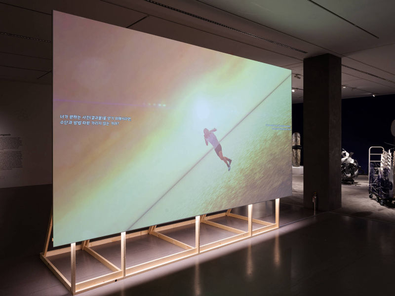 작업을 하며 살아가는 지난함속에서 싹텄을 예술에 대한 짙은 의심과 회의를 국립 미술관의 공간 정중앙에서 펼쳐보았다. 만족스러운 확답이 나 소통, 믿음이 부재했음을 자각한 예술가로서 토로했다. 나의 작업은 단지 개인적인 고민에서 그치지 않고 역사적 사건들에 대한 기억을 담보하고 있다. 지난 2013년 워크온워크에서 열린 개인전〈 Open Path- 관할 아닌 관할>에서도 송전탑, 전투경찰, 미대사관 등 역사적 사건에 관한 의식을 가상공간의 문법으로 보여준 바 있다. 〈나는 울면서 태어났지만, 많은 사람들은 기뻐했다〉(2019) 역시 개인적인 경험이 사회적 사건에 대한 상징으로 치환되는 지점을 보여주는데, 영상 말미에서 죽어가는 군인들을 무심하게 촬영하던 여고생은 다음 장면에서 휴대전화와 함께 바닷물에 잠긴다. 일견 폭력적으로 보이는 이미지는 기술 매체의 확장과 함께 무자비하게 몸집을 불려가는 무관심과 증오를 뜻한다. 그러나 마지막에 이르면, 차갑게 출렁이던 바다는 다시 떠오르는 새벽의 해를 맞이하며 붉은빛을 띤다. 마치 과거만큼 불안하지는 않을, 조금은 더 나을 미래를 조심스럽게 조망한다.
